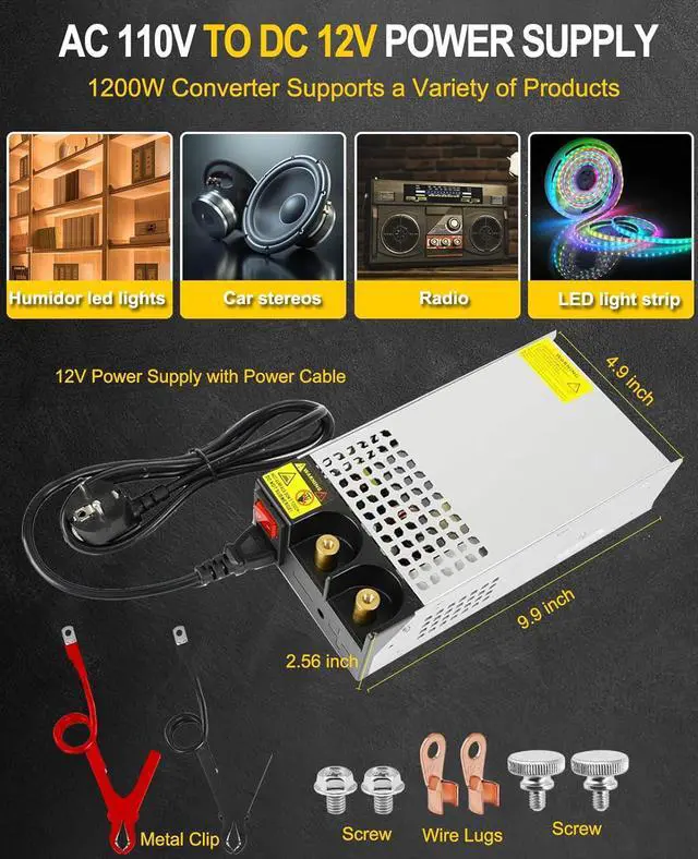 12V Power Supply 1200W build with Imported Aluminum alloy shell ,Built-in wire integrated design, Dual power connection methods, Very convenient for 12V devices with clamps,100 amp power supply come with ul power cord ,12v converter with switch ,wire lugs,metal clip and screw.Super convenient for devices with clamps. You can clamp to the two cylindrical contacts directly. It is a patent design of 12v dc power converter