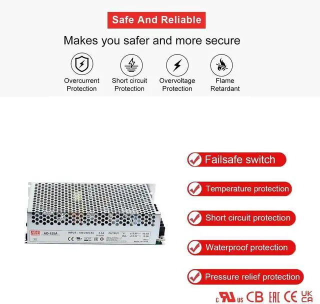 5-in-1 Safety Protection UL TUV certified AD-155A features short circuit/overvoltage protection (15.87-18.63V).