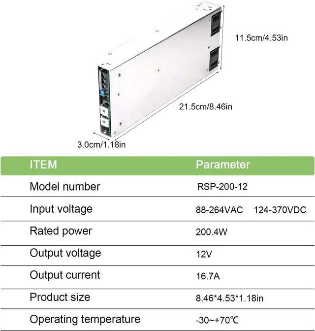 Reliable Performance: Universal AC input (88-264VAC), delivers stable 12V/16.7A output with low ripple (150mVp-p). Long lifespan with MTBF 224.5K hours. 9-pin terminal block connection.