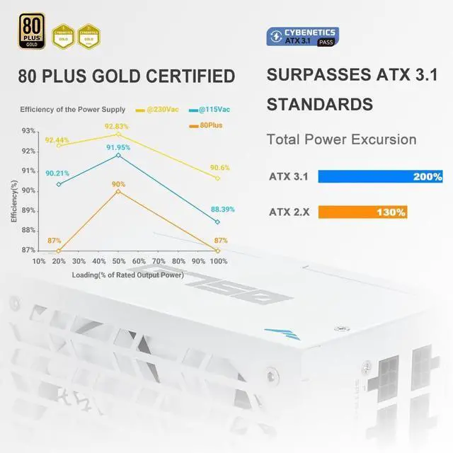 ATX 3.1 & PCIe 5.1 ReadyEngineered to meet the latest Intel ATX 3.1 standard, supporting up to two hundred percent power excursions and latest graphics cards with its native twelve-volt two by six connector for seamless compatibility.