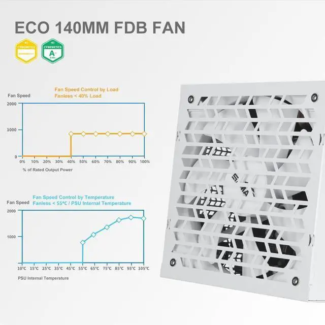 Ultra-Quiet 140mm FDB FanFeatures a fluid dynamic bearing fan operating in silent ECO mode, running fanless below forty percent load while delivering excellent cooling with minimal noise.
