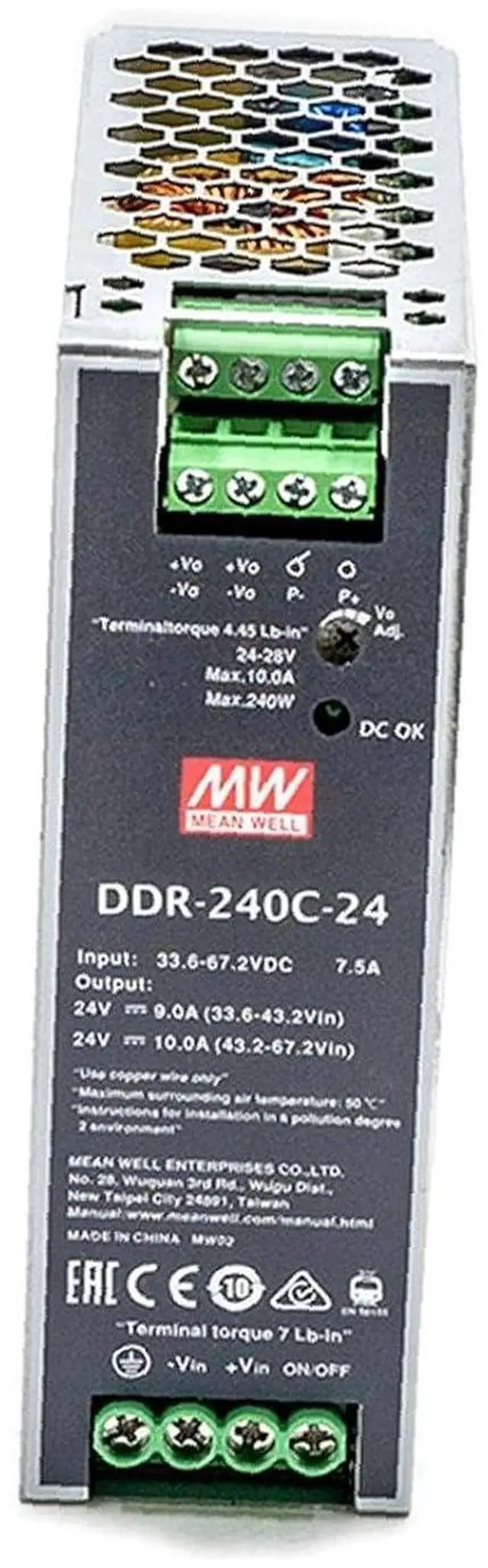 Reliable: 33.6-67.2VDC input range, 24V/10A output, 240W rated power, 91% efficiency. Features a wide input voltage range, constant current protection, and overvoltage protection for enhanced reliability.