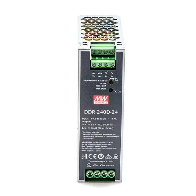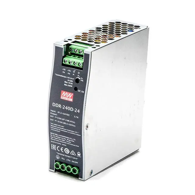 The TorqCali DDR-240D-24 is a high-performance 240W DIN rail mount DC-DC converter designed for demanding industrial applications requiring a stable and reliable 24V DC power source. Featuring a wide input voltage range of 180-420VDC and a constant current output of 10A, this converter is ideal for powering a wide range of industrial equipment, including automation systems, robotics, telecommunications devices, and more.