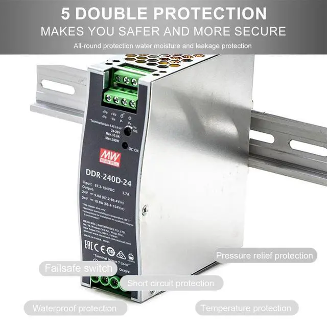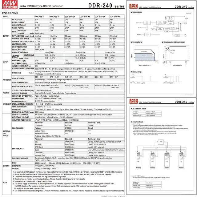 The DDR-240D-24 boasts a durable metal casing and a convenient remote on/off control function, providing added flexibility and control over your system. Compliance with EN55032 and EN61000-6-2 standards for electromagnetic compatibility ensures reliable operation in noise-sensitive environments.