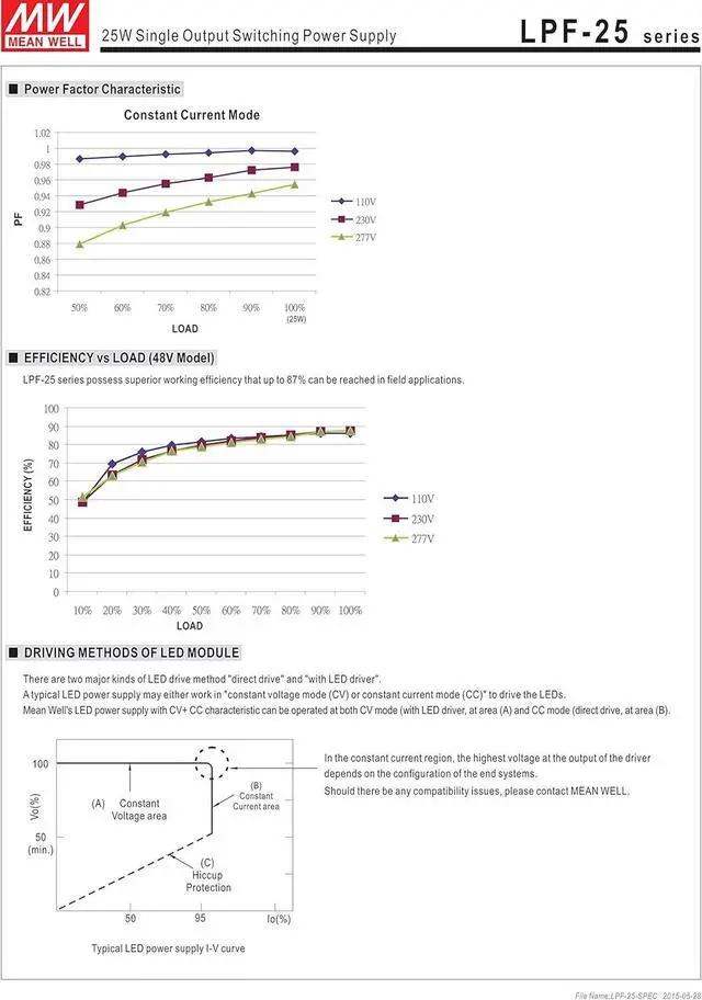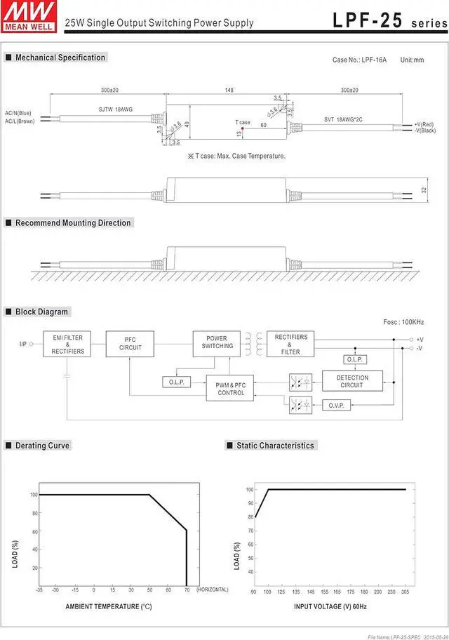 Universal AC input (up to 305VAC) / Full range Built-in active PFC function Suitable for dry, damp, and wet location Suitable for LED lighting and moving sign applications 5 years warranty