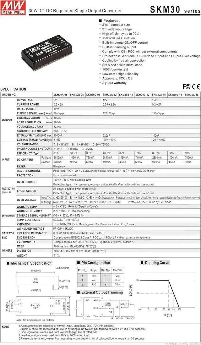 MEAN WELL SKM30C-05 5V 0.6~6A 30W DC-DC Regulated Single Output Converter DC/DC Converter