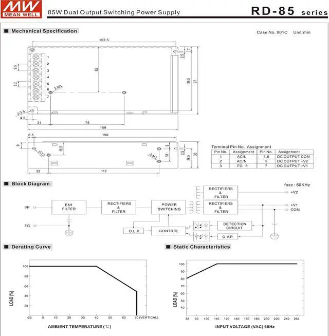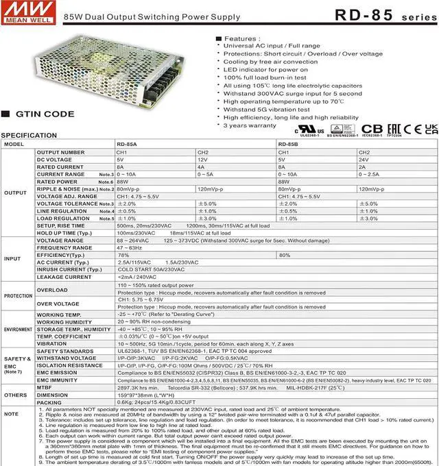 LED indicator for power on 100% full load burn-in test All using 105 long life electrolytic capacitors Withstand 300VAC surge input for 5 second High operating temperature up to 70