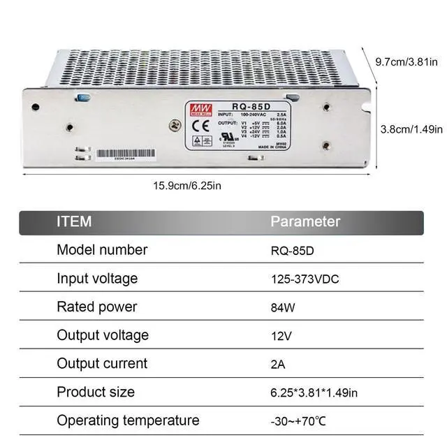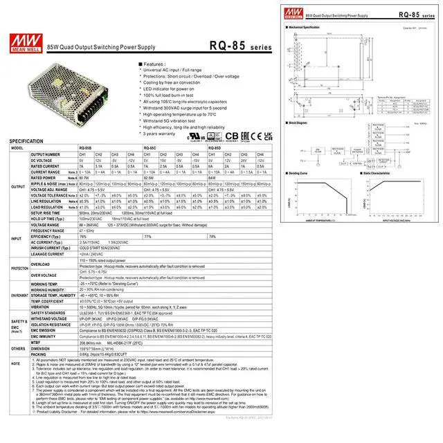 Wide Operating Temperature Range and Industry-Standard Certifications: Designed for challenging thermal conditions, the RQ-85D operates reliably from -25°C to +70°C. It holds UL62368-1 and TUV BS EN/EN62368-1 safety certifications, ensuring compliance with industry standards and providing peace of mind for your application.