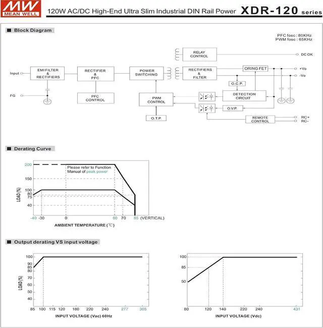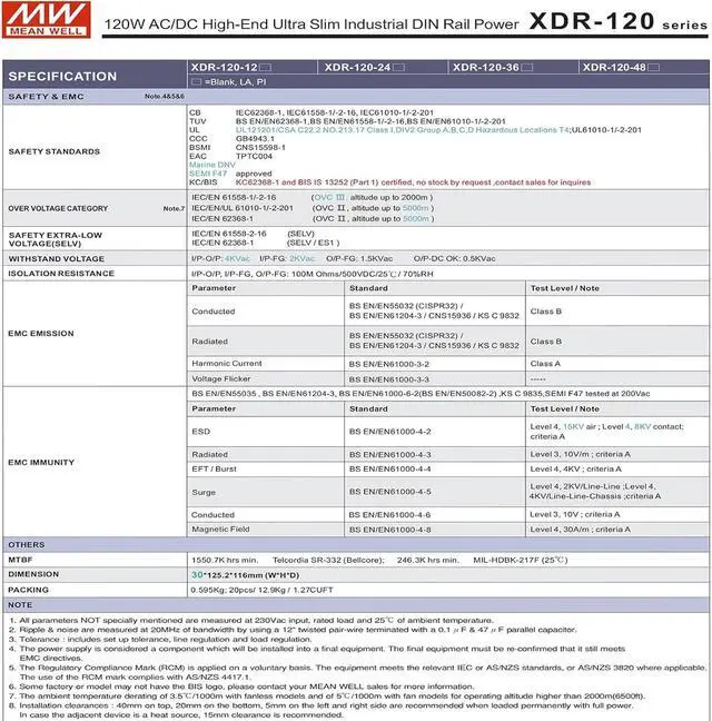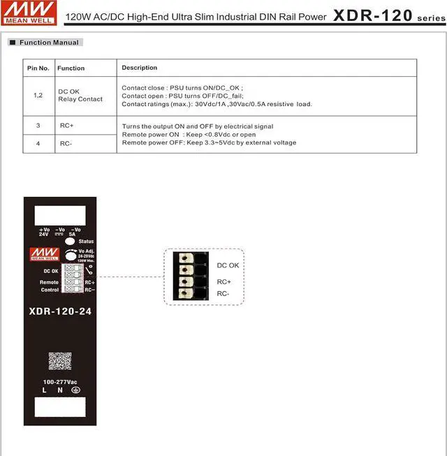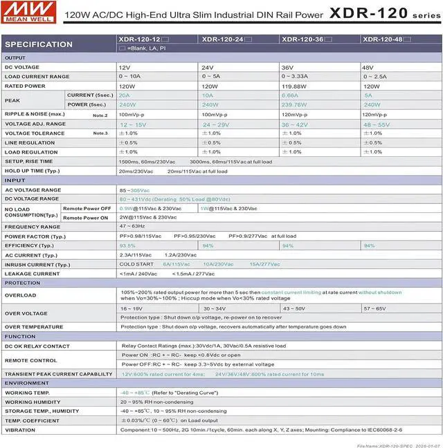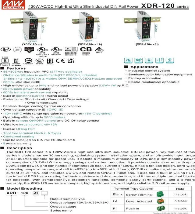 The XDR-120 series is a 120W AC/DC high-end ultra slim industrial DIN rail power.
