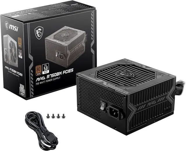 MSI MAG A750BN PCIE5, Non-Modular Compact Gaming 750W Power Supply, 80+ Bronze, Low-Noise Fan,12V-2x6 Cable, PCIE 5.0 Ready, 5 Year Warranty
