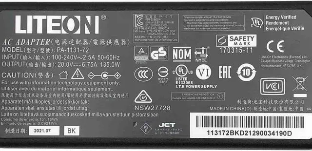 Genuine Liteon PA-1131-72 AC Power Adaper 20V 6.75A 135W Power Supply for Kensington SD2400T SD4750P Docking Station w/PC OEM