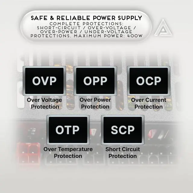 Cooling: Forced Air Ventilation by 1 x 40mm Double Ball Bearing Fan. Various protections including: Overvoltage Protection (OVP), Overload Protection (OLP), Overcurrent Protection (OCP), Heating Protection (OTP), and Short Circuit Protection (SCP)