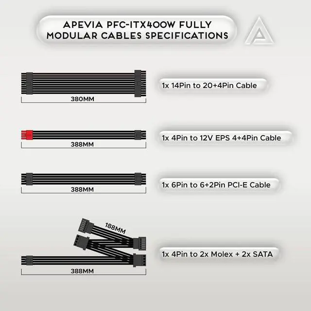 Fully Modular Power Supply: Standard Mini-ITX / FLEX ATX type. Full Range Active PFC 90-264V. Maximum Power: 400W.