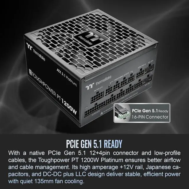 Power for Any PlatformWhen you need power, efficiency, compact design, and quiet operation the PT Series is a perfect choice. Packing features like dual Native PCIe 5.1 12V-2x6, ATX 3.1, dual-color H++ connectors, 80 PLUS Platinum Certification and 140mm case length.