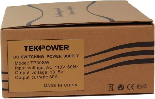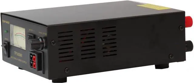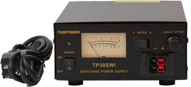 The TekPower TP30SWI is a professional analog DC power supply for powering many devices such as Ham/CB radio and amplifiers. It is a highly stable, fused, high quality switching power supply with 13.8V fixed DC power output, and 30A max current. It has a main DC output on the back of the unit and a snap in output on the front. It has excellent line and load regulation, low ripple and noise. It is designed to minimize switching noise specifically for communication uses. When there is noise, you can use the noise offset knob to eliminate it. It has many safety protection such as overheat and short circuit protection. It comes with basic 1 Year USA warranty.