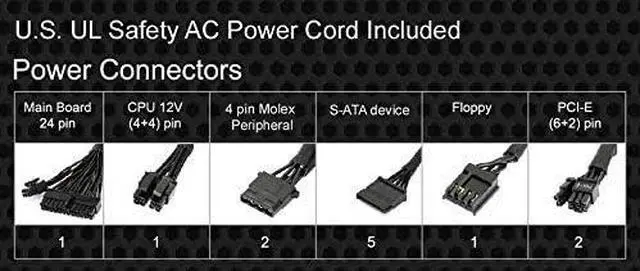 POWER CONNECTORS: 1 x 20+4pin Main (supports 20 or 24pin motherboard), 1 x 4+4 12V (supports standard 2x2 P4 or 2x4 8pin 12V board), 2 x 6+2 PCIe (for 6pin or 8pin PCIe graphic card), 5 x SATA, 2 x Peripheral, 1 x Floppy Drive. ** Note: Use of PCIe splitters or molex-to-PCIe power adapter cables is not recommended. **