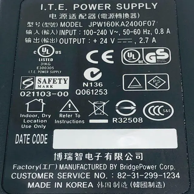 MPN: Original OEM ITE, AC DC Adapter, Power Adapter, Charger, JPW160KA2400F07, 24V, 2700 mA, 65W, E300305, JPW160KA2400F
