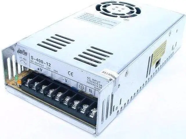 Connect this unit to 110 or 220 Volts AC household power, and it will supply 400 Watts at 12 Volts DC and 33 Amps. This power supply has been engineered specifically for use with DC motors. Most power supplies designed for use with LED lighting or other electronics will simply shut down when exposed to the high current demands of motors. Built-in current limiting protects the unit from overloads and short circuits. The current limiting feature enables these power supplies to keep functioning through the high-current start-up surges from motors. AmpFlow power supplies will just limit the current to the rated maximum even when a larger load is called for, (like when a DC motor starts up). Also, inductive loads (like motors) can cause damage to power supplies that are not designed for them. These power supplies also work well in any application where AC line voltage needs to be converted to DC voltage. Other uses include LED lighting, HAM radio, battery charging, and replacing plug-in AC adapters when more power is required. Short-circuit and overload protections help these units survive harsh operating conditions. The power supply shuts down temporarily if the temperature, current, or voltage goes beyond the safe operating range, and it starts up again automatically when the condition goes away no rebooting is necessary. This high-efficiency power supply has an output voltage that is adjustable by plus or minus 10%. It includes an EMI filter to minimize interference with radio signals and a soft-start circuit that reduces the AC inrush current peaks. Every power supply goes through a full-load burn-in test, so no defective unit leaves the factory. This unit meets all the following safety and EMC standards: UL 1950, EN60950, EN55022, IEC100-3-2, CE, ROHS AmpFlow® power supplies are available in 5V, 12V, 24V, 36V, and 48 Volts at up to 1000 Watts. Search for "AmpFlow power supply" for more choices.