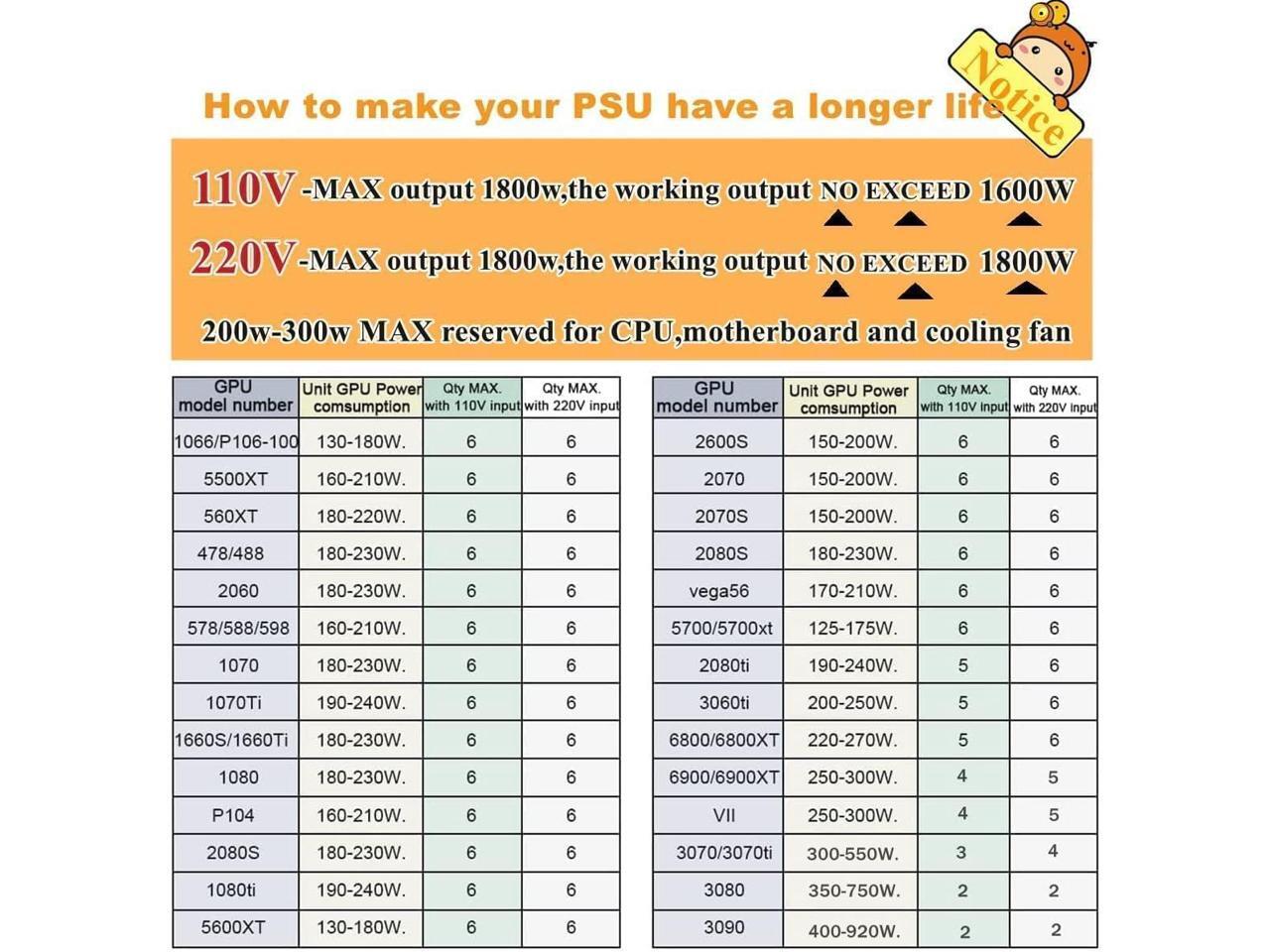1800W Mining Power Supply Support 8 GPUs GPU Mining Rig, for ETH Bitcoin Ethereum Miner with Auto-Thermally Controlled Fan Supply,Designed for US Voltage 110V