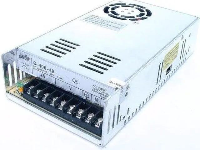 Connect this unit to 110 or 220 Volts AC household power, and it will supply 400 Watts at 48 Volts DC and 8. 3 Amps. This power supply has been engineered specifically for use with DC motors. Most power supplies designed for use with LED lighting or other electronics will simply shut down when exposed to the high current demands of motors. Built-in current limiting protects the unit from overloads and short circuits. The current limiting feature enables these power supplies to keep functioning through the high-current start-up surges from motors. AmpFlow power supplies will just limit the current to the rated maximum even when a larger load is called for, (like when a DC motor starts up). Also, inductive loads (like motors) can cause damage to power supplies that are not designed for them. These power supplies also work well in any application where AC line voltage needs to be converted to DC voltage. Other uses include LED lighting, HAM radio, battery charging, and replacing plug-in AC adapters when more power is required. Short-circuit and overload protections help these units survive harsh operating conditions. The power supply shuts down temporarily if the temperature, current, or voltage goes beyond the safe operating range, and it starts up again automatically when the condition goes away no rebooting is necessary. This high-efficiency power supply has an output voltage that is adjustable by plus or minus 10%. It includes an EMI filter to minimize interference with radio signals and a soft-start circuit that reduces the AC inrush current peaks. Every power supply goes through a full-load burn-in test, so no defective unit leaves the factory. This unit meets all the following safety and EMC standards: UL 1950, EN60950, EN55022, IEC100-3-2, CE, ROHS AmpFlow® power supplies are available in 5V, 12V, 24V, 36V, and 48 Volts at up to 1000 Watts. Search for "AmpFlow power supply" for more choices.