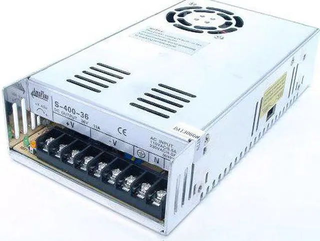 Connect this unit to 110 or 220 Volts AC household power, and it will supply 400 Watts at 36 Volts DC and 11 Amps. This power supply has been engineered specifically for use with DC motors. Most power supplies designed for use with LED lighting or other electronics will simply shut down when exposed to the high current demands of motors. Built-in current limiting protects the unit from overloads and short circuits. The current limiting feature enables these power supplies to keep functioning through the high-current start-up surges from motors. AmpFlow power supplies will just limit the current to the rated maximum even when a larger load is called for, (like when a DC motor starts up). Also, inductive loads (like motors) can cause damage to power supplies that are not designed for them. These power supplies also work well in any application where AC line voltage needs to be converted to DC voltage. Other uses include LED lighting, HAM radio, battery charging, and replacing plug-in AC adapters when more power is required. Short-circuit and overload protections help these units survive harsh operating conditions. The power supply shuts down temporarily if the temperature, current, or voltage goes beyond the safe operating range, and it starts up again automatically when the condition goes away no rebooting is necessary. This high-efficiency power supply has an output voltage that is adjustable by plus or minus 10%. It includes an EMI filter to minimize interference with radio signals and a soft-start circuit that reduces the AC inrush current peaks. Every power supply goes through a full-load burn-in test, so no defective unit leaves the factory. This unit meets all the following safety and EMC standards: UL 1950, EN60950, EN55022, IEC100-3-2, CE, ROHS AmpFlow® power supplies are available in 5V, 12V, 24V, 36V, and 48 Volts at up to 1000 Watts. Search for "AmpFlow power supply" for more choices.