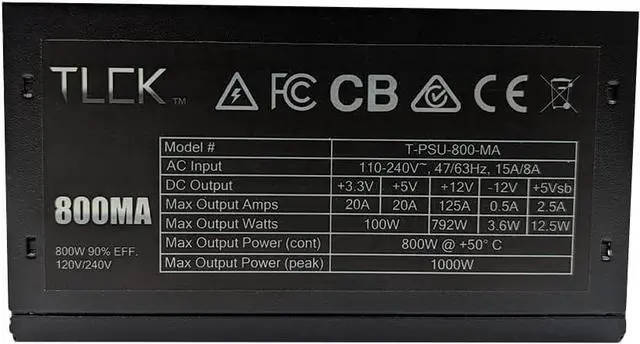 TLCK 800 MA Gaming Power Supply, 90% Efficiency, 800W Continuous Load, Fully Modular, Automatic 110v-220v switching, Active PFC, T-PSU-800-MA Specs - Stable Power Output using Active PFC - Fully Modular - Cables Included - 800W Continuous Load - 90% Efficiency @ 50% Load - 110/240v Automatic Switching - Variable 140mm Fan - All common protections (OVP/UVP/OPP/SCP/OCP) Connections - ATX (24-pin) : 1 - SATA : 3 - EPS (CPU) : 1 - PCIe : 4