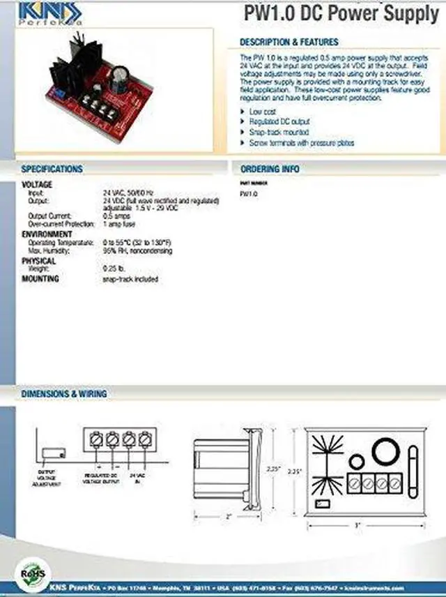 The Model PW 1.0 is a regulated 0.5 amp power supply that accepts 24 VAC at the input and provides 24 VDC at the output. The PW 1.0 can be ordered with any output voltage from the 1.5V to 29 VDC. Field voltage adjustments may also be made using only a screwdriver. The power supply is provided with a mounting track for easy field application. These low cost power supplies feature good regulation and have full overcurrent protection.