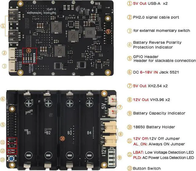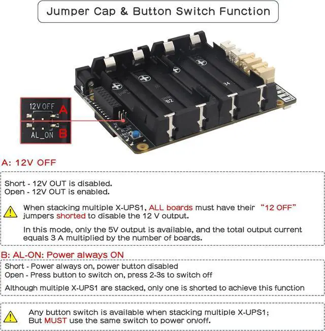 All power input are connected together via the 18-pin female header, output current is subject to the quantity of boards.You can use same one board to turn on/off all stackable boards. (be noted that which board you press the button to turn on, also must press the same board button to turn off.)Only one AL_ON jumper caps be shorted to enable Always Power On when stacked multiple X-UPS1 shields.MUST ALL 12 OFF jumper caps be shorted to disable 12V output when stacked multiple X-UPS1 shields. The batteries is not included in the packing list!!!