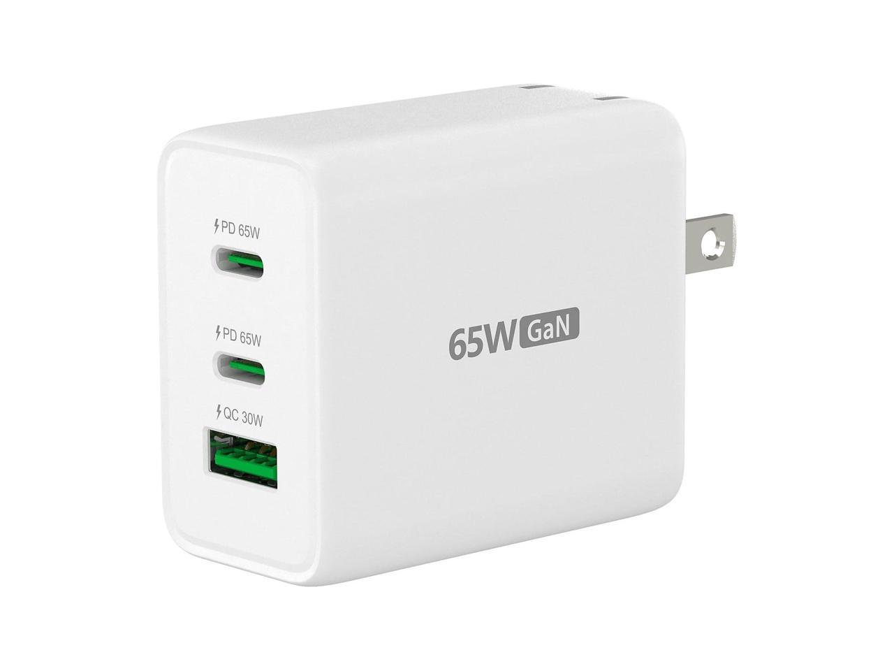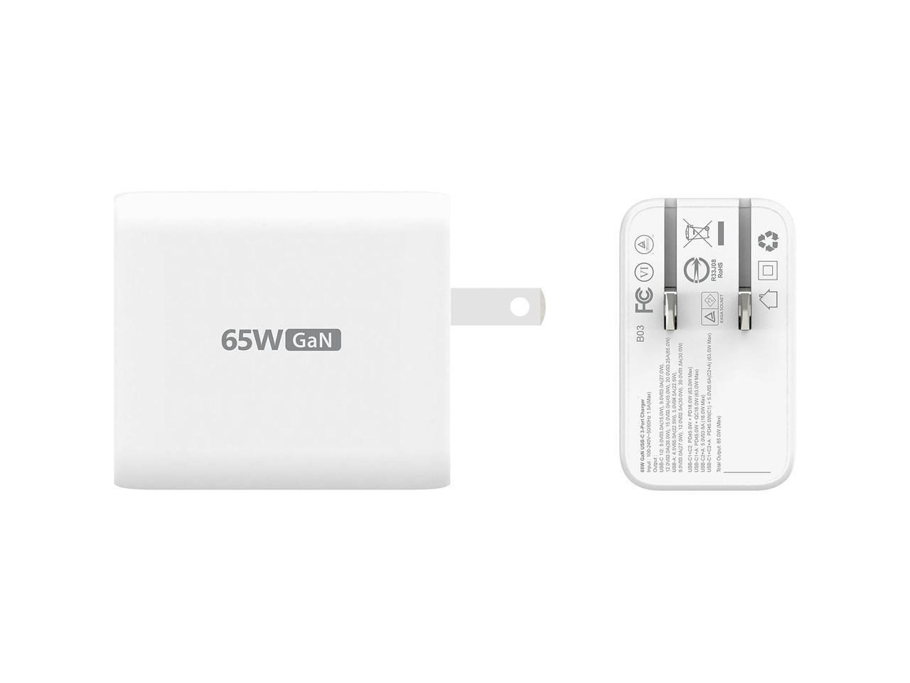 - Ultracompact and portable three-port GaN charger can simultaneously charge two USB Type-C devices and one USB Type-A device. USB Type-C output: 5V 3A/9V 3A/12V 3A/15V 3A/20V 3.25A (65W maximum); USB Type-A output: 5V 4.5A/9V 3A/12V 2.5A (30W maximum). USB Type-A port provides fast charging up to 30W when used alone. Surge, overcharging, overvoltage, overcurrent, and overheating protection is included to keep your devices safe. Comes in white.