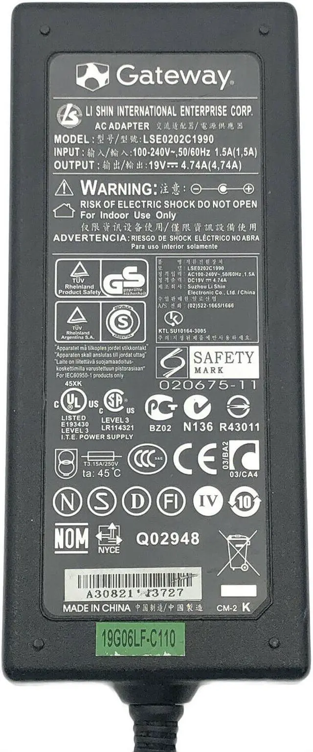 Genuine Gateway Li Shin LSE0202C1990 AC Adapter Charger 19V 4.74A 90W w/P.Cord