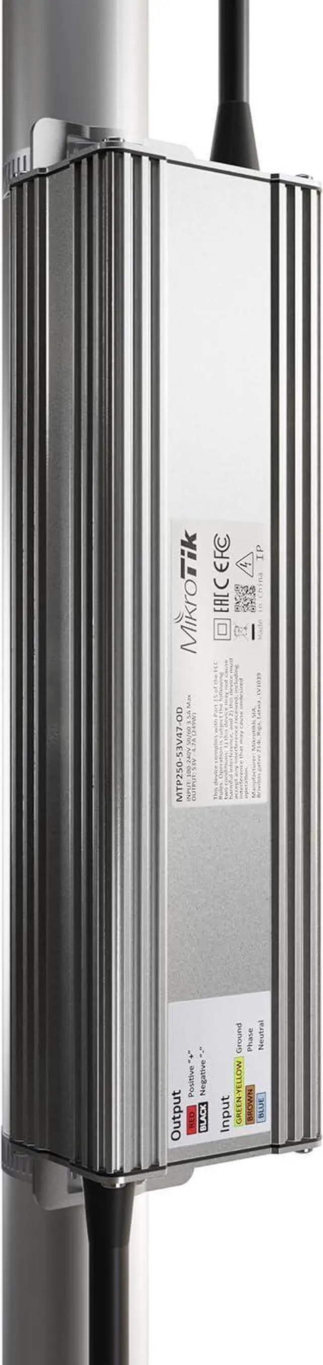 Outdoor 53V 250W AC/DC power supply units for the MikroTik netPower product line. Built for situations when your outdoor switches need that extra juice. Pole/wall mount compatible!
