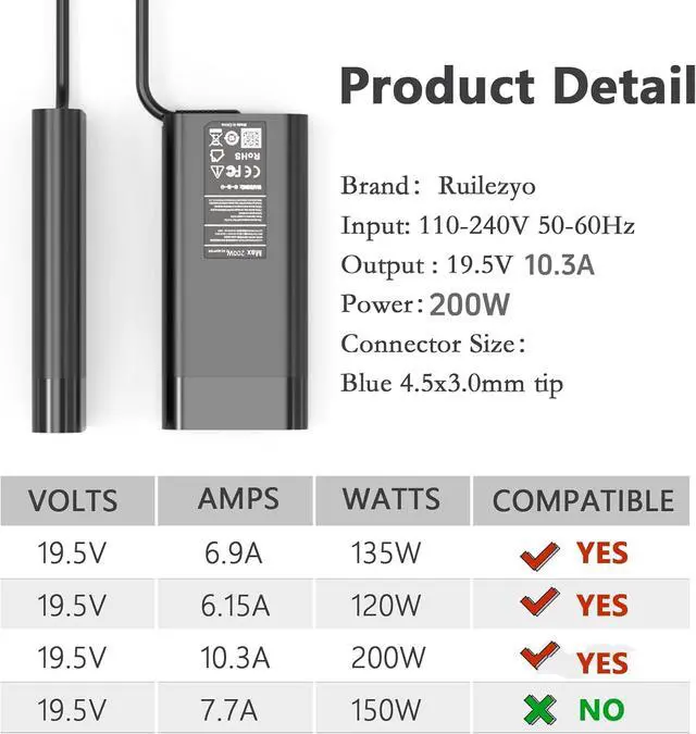Output Max: 19.5V 10.3A 150W; 19.5V 7.7A 150W;