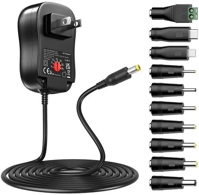 Adjustable Voltage Universal AC Adapter - Input AC 100-240V, 50/60Hz; DC plug Output: 6V 3A, 9V 3A, 12V 3A, 15V 2.4A, 18V 2A, 20V 1.8A, 24V 1.5A; USB port Output: 5V 1A. total power: 41 watts. Advanced secure technique, with multiple protection against over-voltage, over-current, short-circuit and overheat