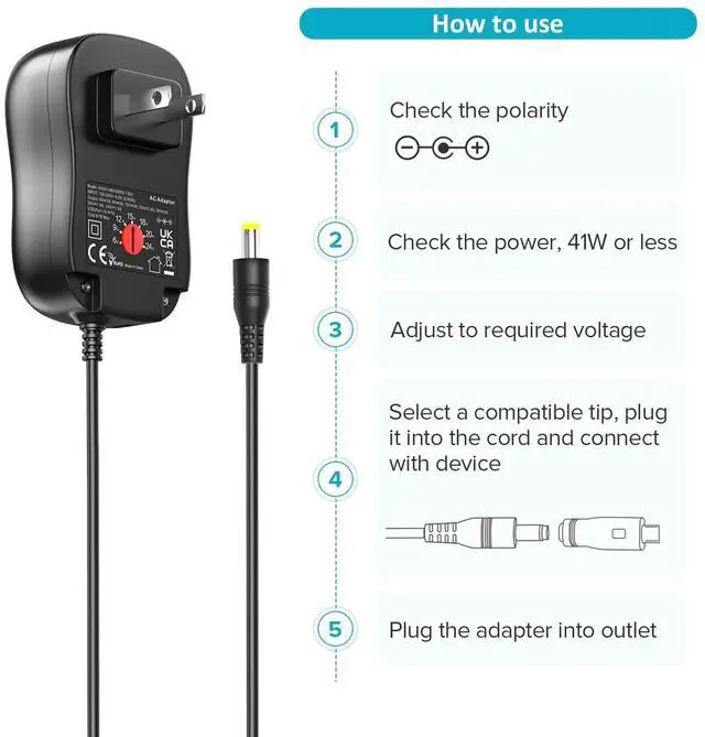 DC Polarity: inner Positive(+), outer Negative(-), Polarity is Not reversible. What You Get: 1 x universal AC to DC power adapter, 10 x Interchangeable DC tips. Please Double check the DC tip dimensions to ensure the compatibility