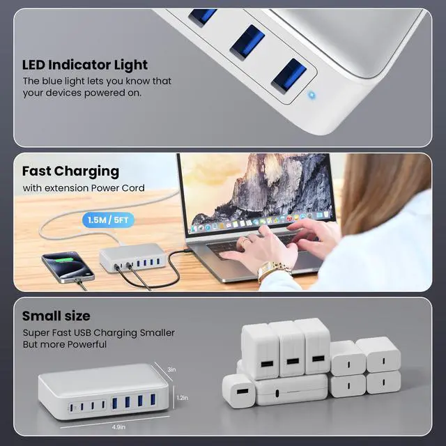 USB C Charger Block,Upgraded GaN III 8-Port Fast Charging Station Hub,PD Laptop Charger Adapter Compatible with MacBook Pro/Air,DELL,Steam Deck