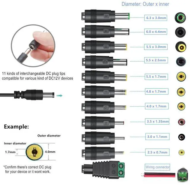 This 12v power supply comes with 11 DC plug tips.It is widely used in small electronic products, Suitable for light strip, string light, wireless router, ADSL Cat, HUB, switch, security camera, speaker, receiver, Amp, audio/video power supply, and many other household electronics.