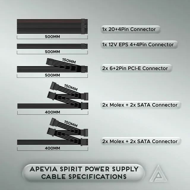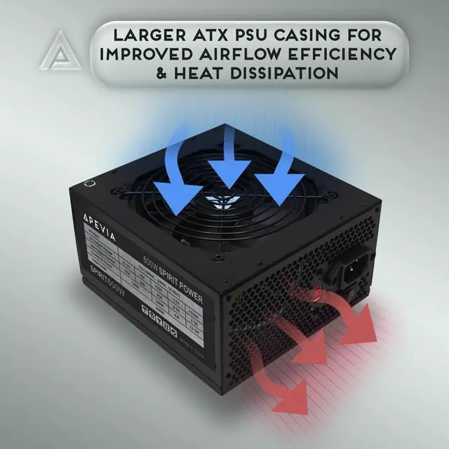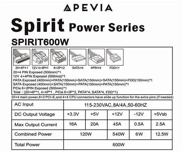 Apevia’s Spirit line of power supplies bring form and function to your system, providing high efficiency with a basic black look that fits ATX computer builds. It supports the modern 12v 2.3 power standard with a single 12V rail setup. Boasting a silent 120mm black fan, it keeps everything inside the system cool. Larger ATX PSU casing on the Apevia Spirit improves airflow efficiency and heat dissipation. Comes with enough cables to connect all the devices you might need. The ATX-SP600 power supply is perfect for mid-range builds for both business and gaming use.