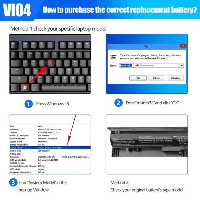 - Check your specific laptop model name by pressing [Win] + [R] key and entering [msinfo32] or [dxdiag]. Click OK to find your system model. Use your laptop model name to find the correct replacement battery.