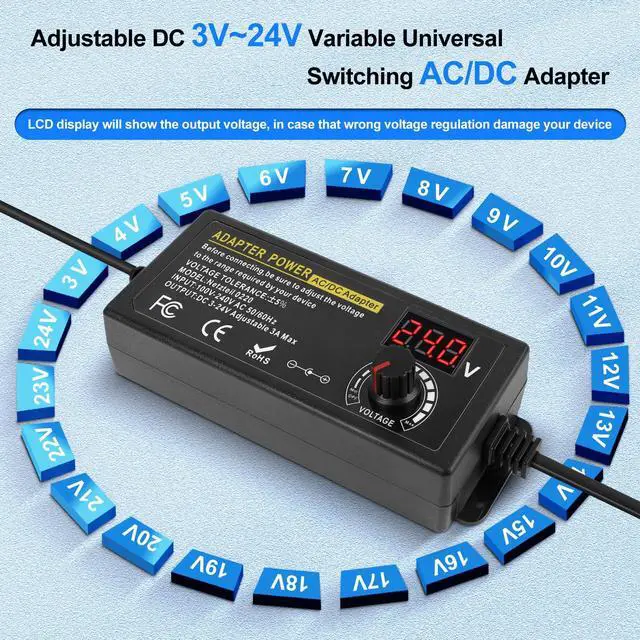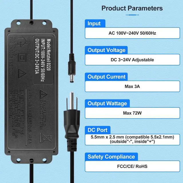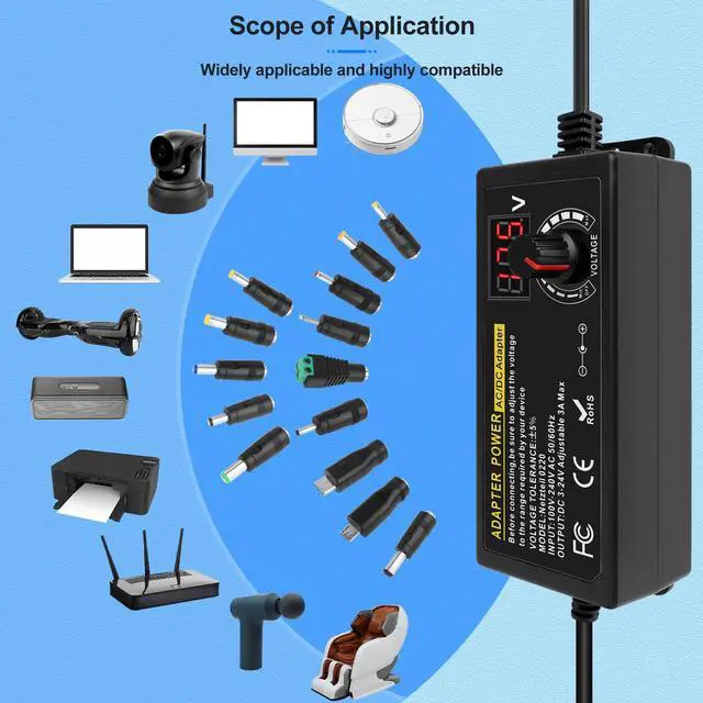 Parameters: Input: AC 100- 240V, 50/60Hz; Output: DC 3~24V adjustable, maximum 3A 72W; It is suitable for most appliances with an input voltage between 3V and 24V and a rated power of 72 watts or less