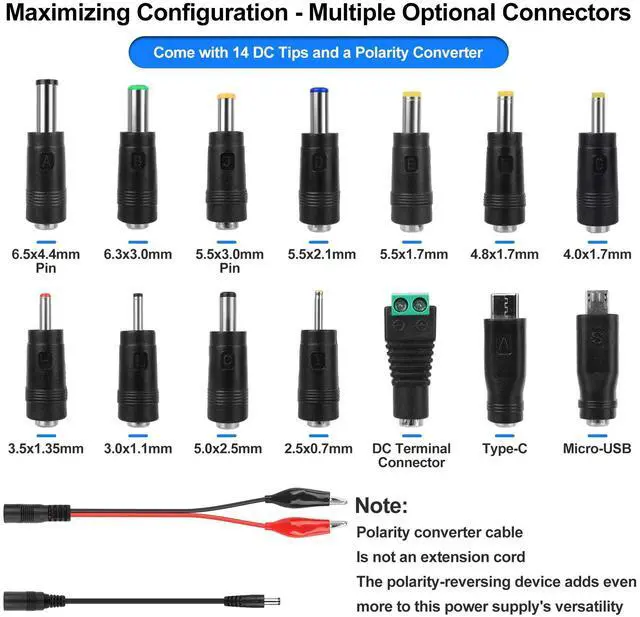 Converter Head List: 14 DC plugs: 6.5x4.4mm+pin, 5.5x2.1mm, 5.5x3.0mm+pin, 5.0x2.5mm, 6.3x3.0mm, 5.5x1.7mm, 4.8x1.7mm, 4.0x1.7mm. 3.5x1.35mm, 3, 0x1.1mm, 2.5x0.7mm, micro USB, Type-C, and DC terminal connectors. Covering all common electronic devices and powering multiple devices