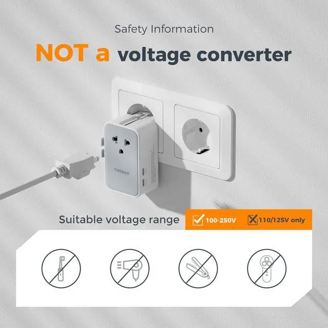 Before using the international travel adapter, please check your devices to support 100V to 250V dual voltage. Especially hair dryer, curling iron, straightener, electric razor, etc.