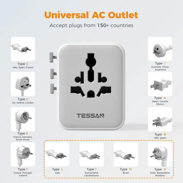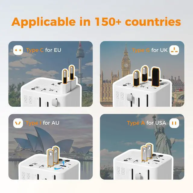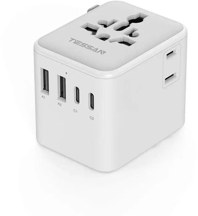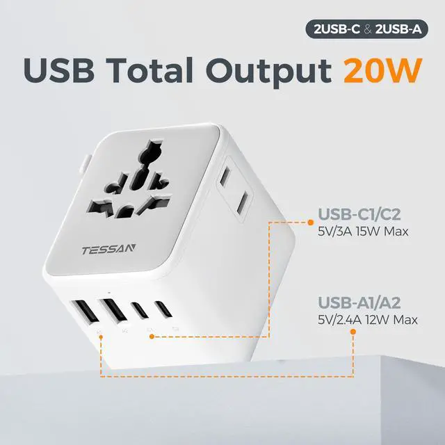 Universal travel adapter features USB C1 C2 (5V 3A, 15W Max per port), charge phone, tablet, and other devices, reducing waiting time. Travel adapter worldwide also has 2 USB A (5V 2.4A, 12W Max per port) to satisfies the charging demands of diverse