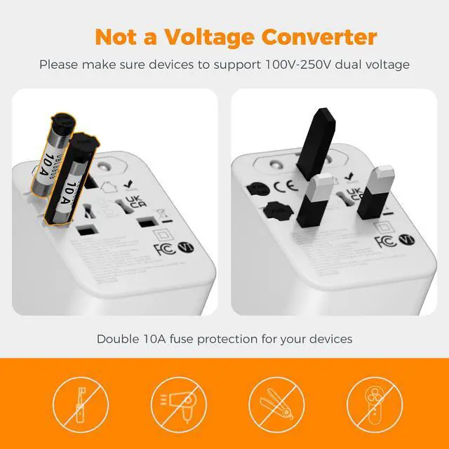 Before using the universal adapter for travel, please check your devices to support 100V to 250V dual voltage. Especially hair dryer, curling iron, straightener, electric razor, etc.