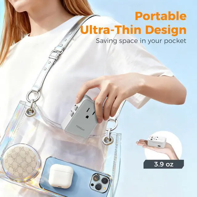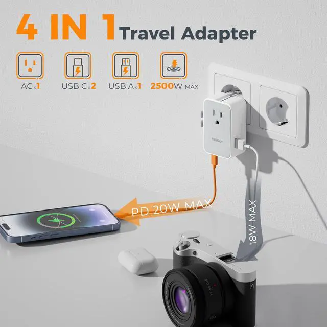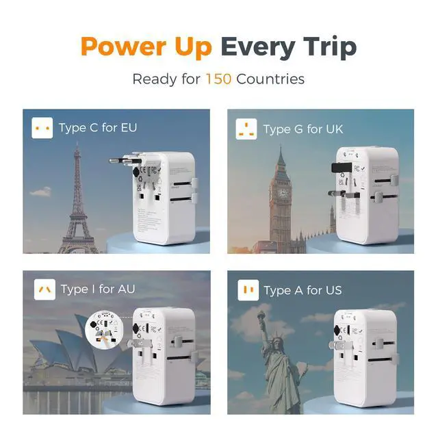 Equipped with 2 USB C PD port (20W max per port) and 1 USB A port (18W max), this international power adapter quickly charges your phone, earphones and other devices.