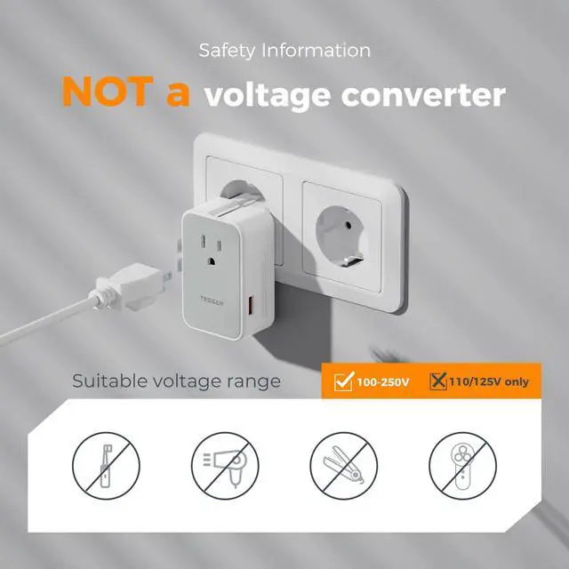 Before using the universal power adapter, please check your devices to support 100V to 250V dual voltage. Especially hair dryer, curling iron, straightener, electric razor, etc.