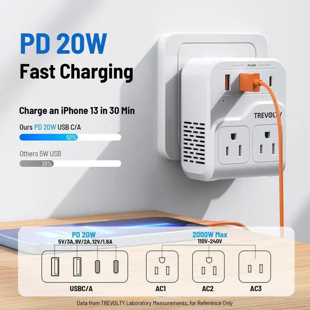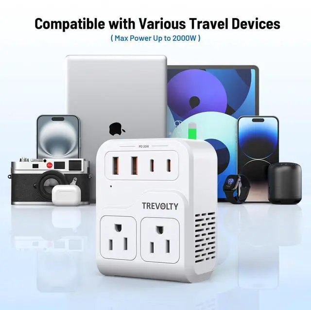 2000W 7-in-1 European Travel Plug Adapter - 3 AC Outlets (support 2000W for high-power devices) + 4 USB Ports (2 USB-A + 2 USB-C, 9V/2A, PD 20W). Power 7 devices simultaneously. Note: This travel adapter is NOT a voltage converter. Please ensure your devices support dual voltage (100240V)!