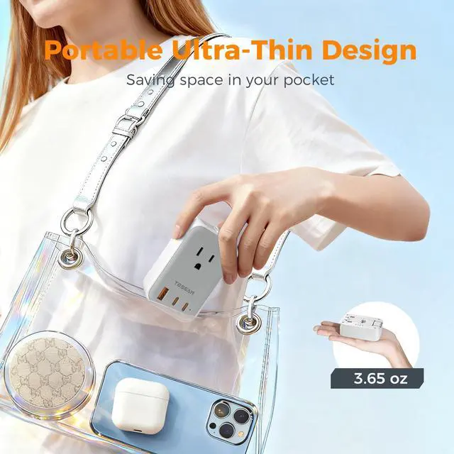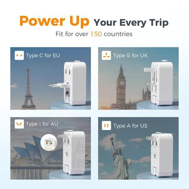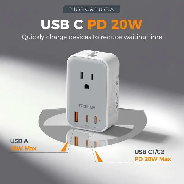 Equipped with 2 USB C PD port (20W max per port) and 1 USB A port (18W max), this international power adapter quickly charges your phone, earphones and other devices, reducing your waiting time and making travel easier.
