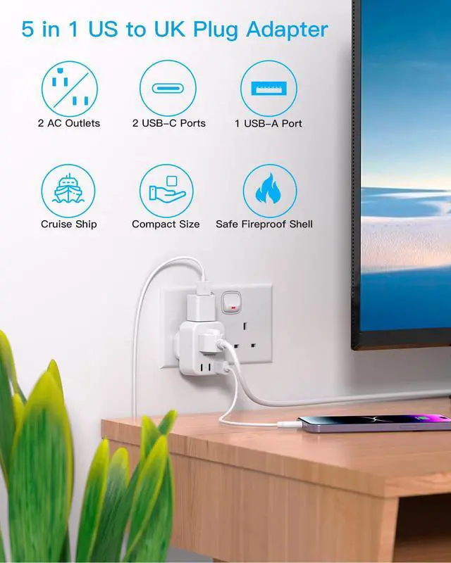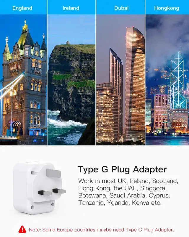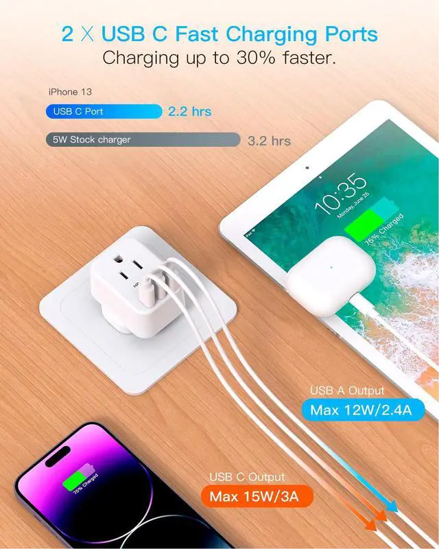 The uk travel plug adapter add 2 USB-C ports for more demand. USB-C port can up to 5V/3A max which is up to 30% faster than other chargers. USB A Port up to Max 5V/2.4A