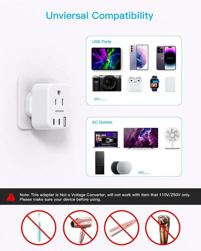 1. This uk travel plug adapter is not a voltage converter. Please make sure your devices especially your hair dryer, straightener,hair curler, electric toothbrush or electric razor need to support 100V to 250V Dual Voltage, If your device are 110V or 125V only, you will need a voltage converter.