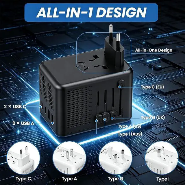 Yes, our power converter includes 1 AC outlet, 2 USB A ports, and 2 USB C ports, meeting your charging needs while traveling.